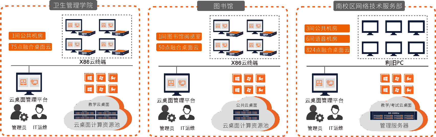 安徽医科大学携手噢易云采用整体规划,分三期共部署949点融合桌面云,交付1773个云桌面系统,覆盖卫生管理学院、图书馆、南校区网络技术服务部,分布于4间公共机房、6间语音机房和1间图书馆阅览室,满足全校两万余人的日常教学、实验实训及考试需求。
