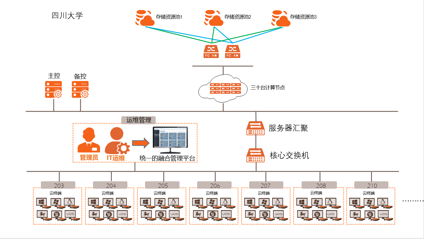 为有效提升教学效率,改善机房教学环境,四川大学引入云计算技术,与噢易云携手部署1200点的教育桌面云,分布在计算机基础实验教学中心和匹兹堡学院的12间公共机房,采用33台全新的云服务器,全面利旧原有老旧PC,通过桌面虚拟化技术,打造焕然一新的桌面云教学环境。