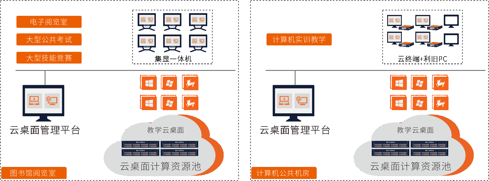 噢易融合桌面云将所有终端机、云桌面系统集中部署在数据中心,然后将用户界面以图像的形式传输到云终端,通过B/S架构平台远程进行桌面部署和更新,简化管理流程,引领图书馆、公共机房IT管理进入云时代。