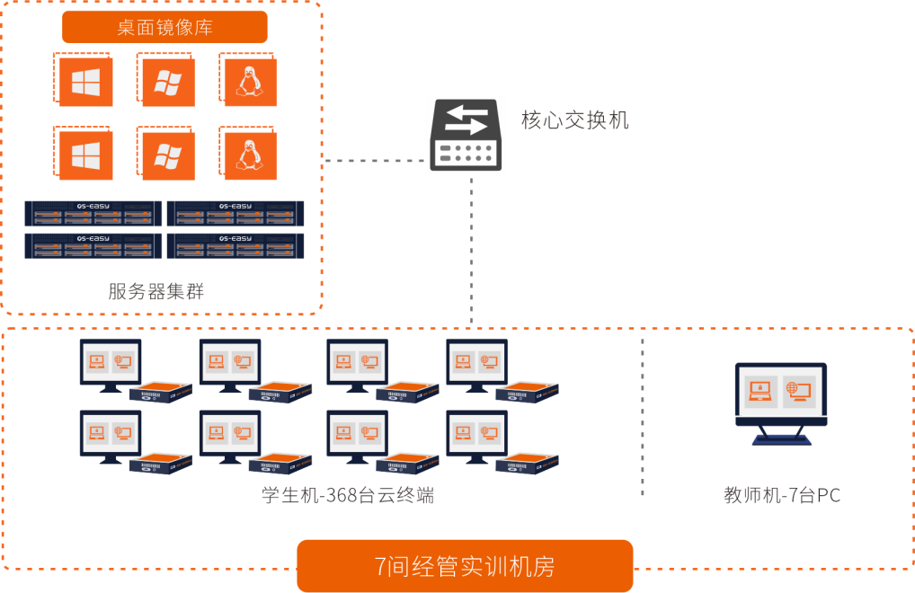 建设新型云实训机房,采用新技术手段改变传统管理模式,降低终端故障率,实现所有终端的统一管理,通过管理平台远程就可以完成教学环境的部署与更新。