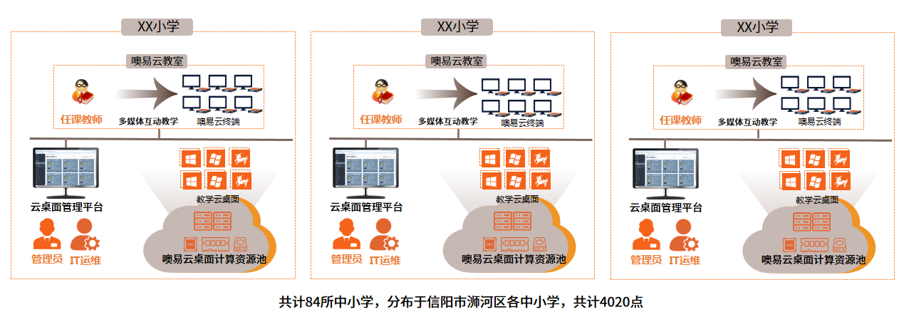 信阳市浉河区教育局2019年携手噢易云,通过整体规划,单期建设4020点云教室系统,覆盖教育局下属市区到乡镇共84所中小学。每间机房采用1台云服务器作为资源共享中心,终端采用免维护、低功耗、绿色节能的云终端设备,配套噢易云教室系统软件和多媒体网络教室软件,安装常用教学应用软件,建设标准化云教室,提升教师和学生用机体验。
