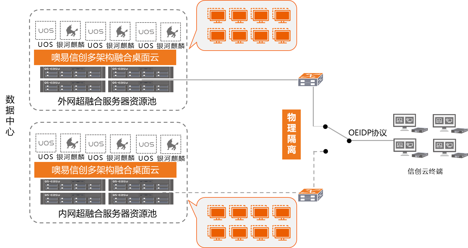 采用一套终端+两套网络+两套资源池,通过图形切换技术,在保证数据物理层面隔离的情况下,实现内外网自由切换,用户可以自有选择接入网络的类型进行办公,实现双网、双终端、内外网隔离办公的目标。为了匹配用户需求,噢易云同时支持两种隔离方式,为客户的个性化需求提供多种选择。