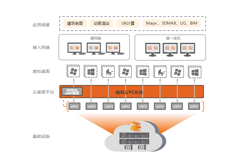 噢易企业vGPU图形设计桌面云解决方案面向生产制造行业,将生产制造过程中图形设计、产品信息、生产数据、客户等核心信息集中存储、部署在数据中心,VDI的移动桌面访问提高业务软件和硬件资源的利用率,具备低成本、灵活性、图形算力高等性能优势。