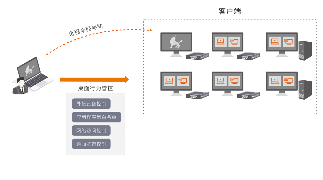 建立桌面安全管控规则,对全域终端设备和桌面环境统一管控,支持远程接入所有大规模、分散异构的终端,对桌面行为进行监控、审计和管理,规范桌面行为,确保资源合理利用。