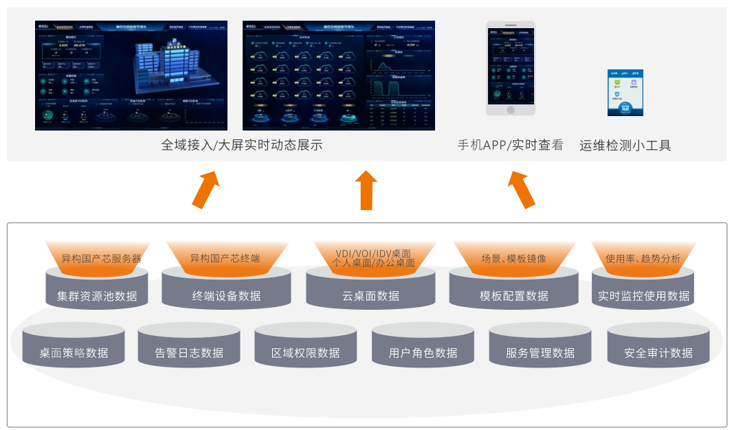 平台融合VDI、VOI、IDV三种桌面云架构,面向不同的使用场景交付不同架构的桌面环境;在⼀个平台内实现界面、资源、桌面、模板、数据5个层次的深度融合;通过单⼀融合管理平台对异构设备、资源、桌面模板、桌面镜像、桌面策略、用户账号与权限实现统⼀管理和集中运维,“⼀朵云,覆盖行业全场景桌面应用需求”。