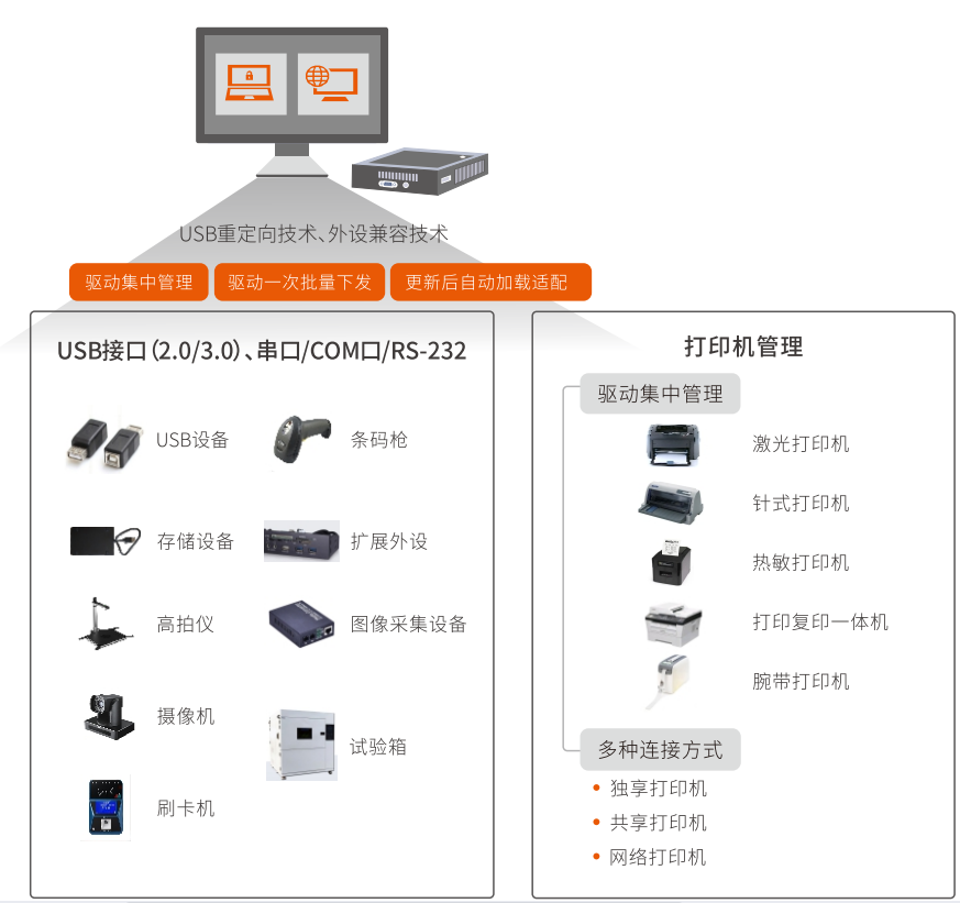工作中经常连接如USB、打印机、读卡器、各类身份识别设备等外接设备,使用方式、兼容性各不一样,导致经常存在不可用的现象,影响工作效率。平台支持外设驱动集中管理、打印机批量管理。