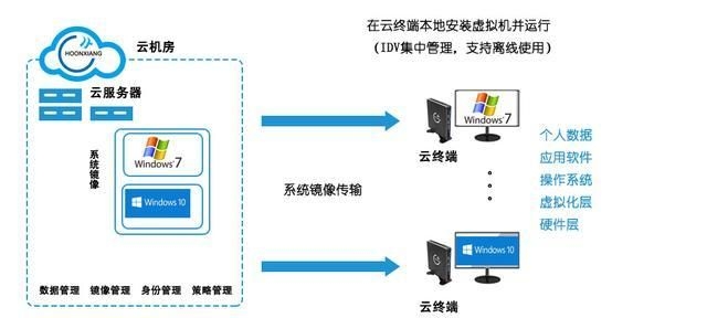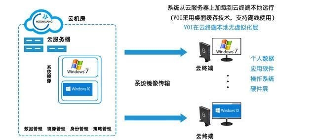 VOI(Virtual OS Infrastructure,虚拟系统架构)VOI的核心是PXE无盘 缓存技术,在架构上类似IDV,但是没有虚拟化层。
