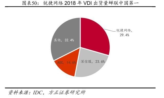 根据 IDC 2018 年下半年 VCC(虚拟客户端)市场排名报告《PRC VCC Software Tracker, 2018 H2》,2018 年中国桌面云市场增速依旧强劲,星网锐捷的桌面云份额第一, 31%%的市场份额;深信服桌面云以 15.9%的占比获第二名,以全年 53.3%的高增长率实现增速排名第一。
