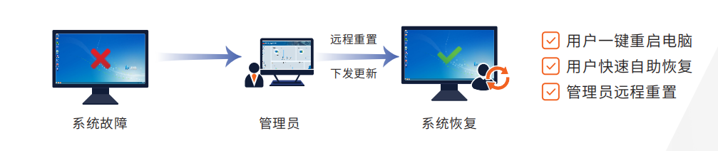• 自助重启解决:丰富的还原性策略提供每次开机后一致、流畅的桌面环境;