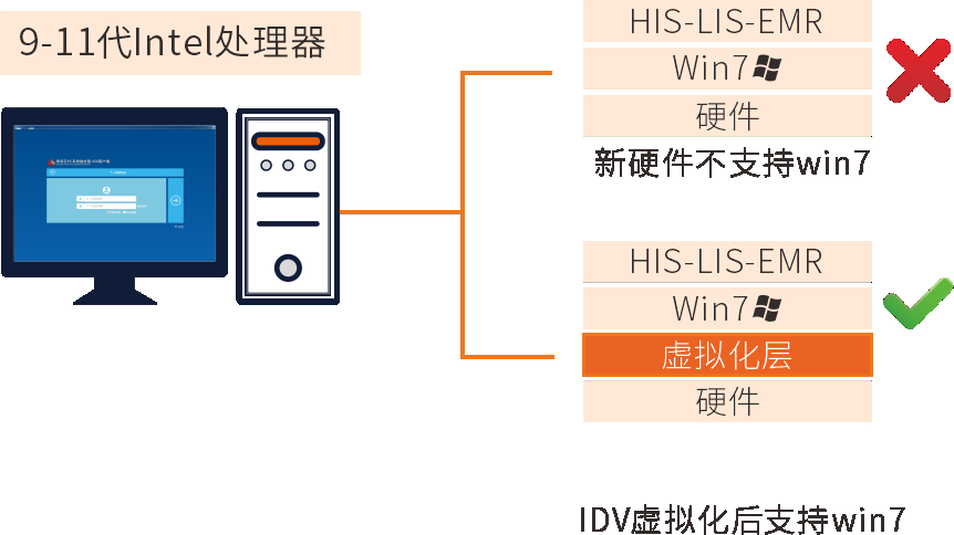 针对9-11代Intel新平台不能直接安装Win7系统问题,通过IDV架构保障终端与HIS业务系统完美兼容,基于融合模板统一管理,不同架构终端基于同一个镜像模板编辑使用。