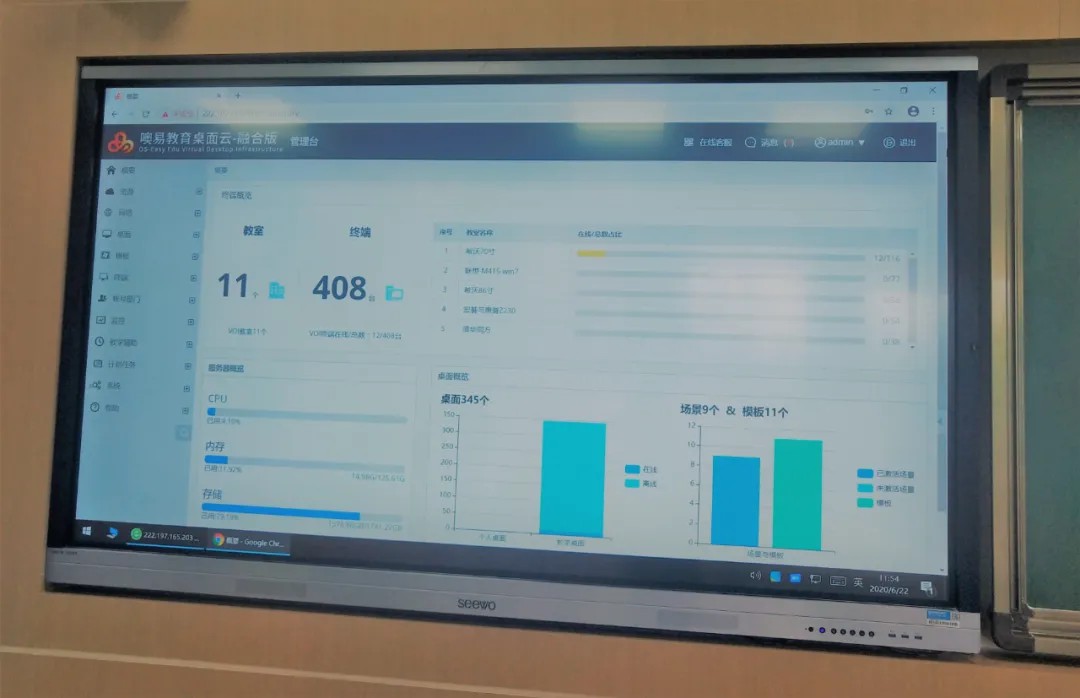 多媒体教室采用利旧方式,对联想、戴尔、希沃、宏基4种终端机型进行资源复用,平衡设备投资和使用问题,并配置高性能云服务器进行统一管理,提升设备性能,提高资源利用率,满足最新的教学应用需求。