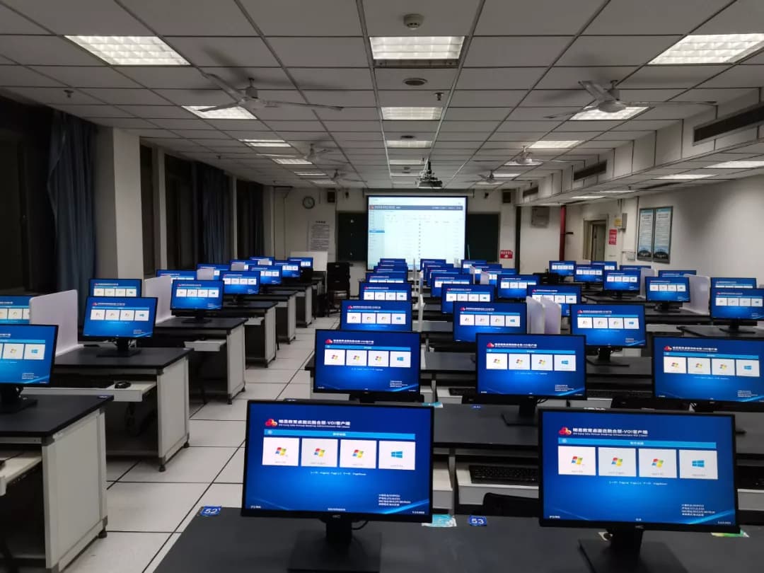 贵州医科大学自2017年开始,以“按需上云”的方式,逐步部署1318点融合桌面云,分布于大健康学院、计算机中心以及多媒体教室,共计15间机房,除满足日常实训教学外,还能承载上万人次的全国计算机等级考试。