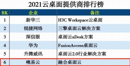 噢易云2021年再次入选“2021云桌面提供商排行榜”,位列榜单第六名。