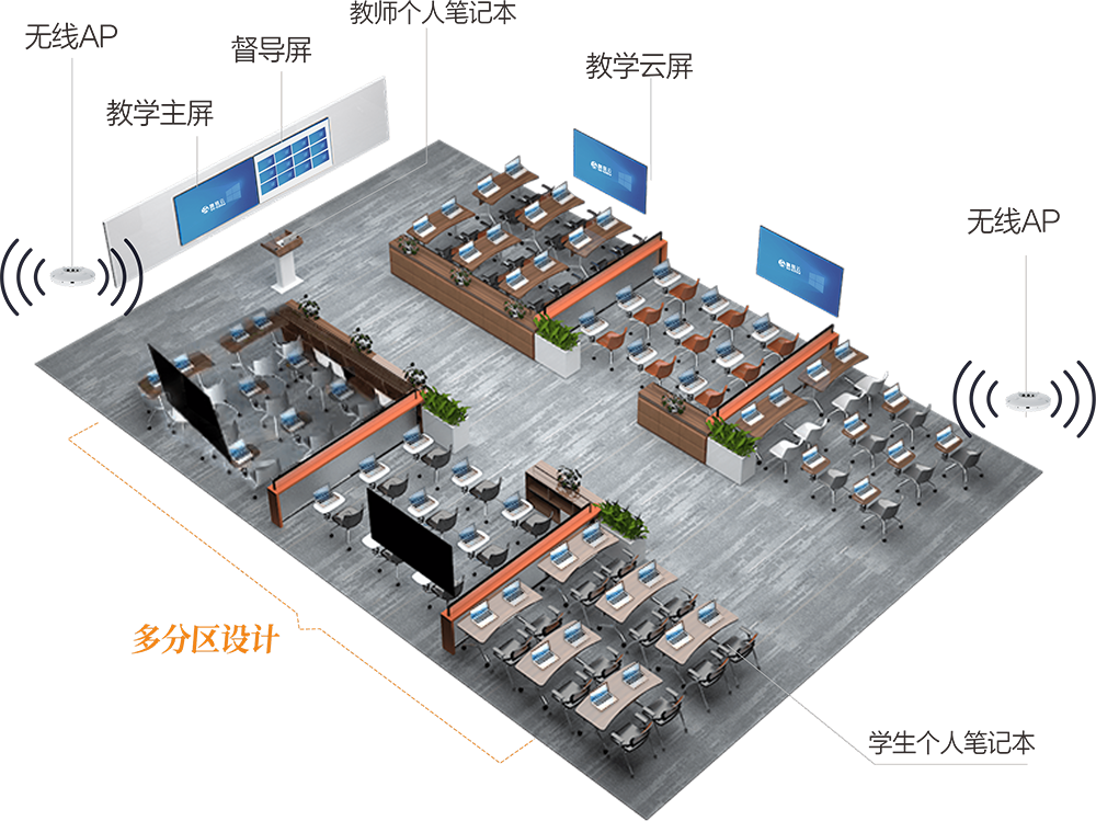 特征:个人笔记本接入、无线、线上实训教学演示、跟屏实操、移动教学模式。