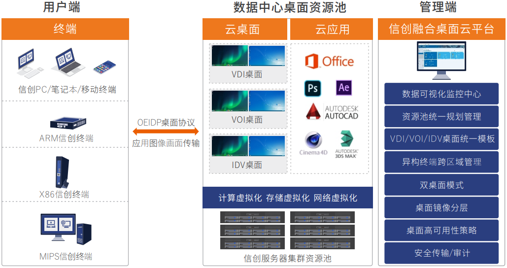 融合了三种主流桌面云技术(VDI/VOI/IDV)架构,实现“界面、资源、桌面、模板、数据”5个层次的深度融合