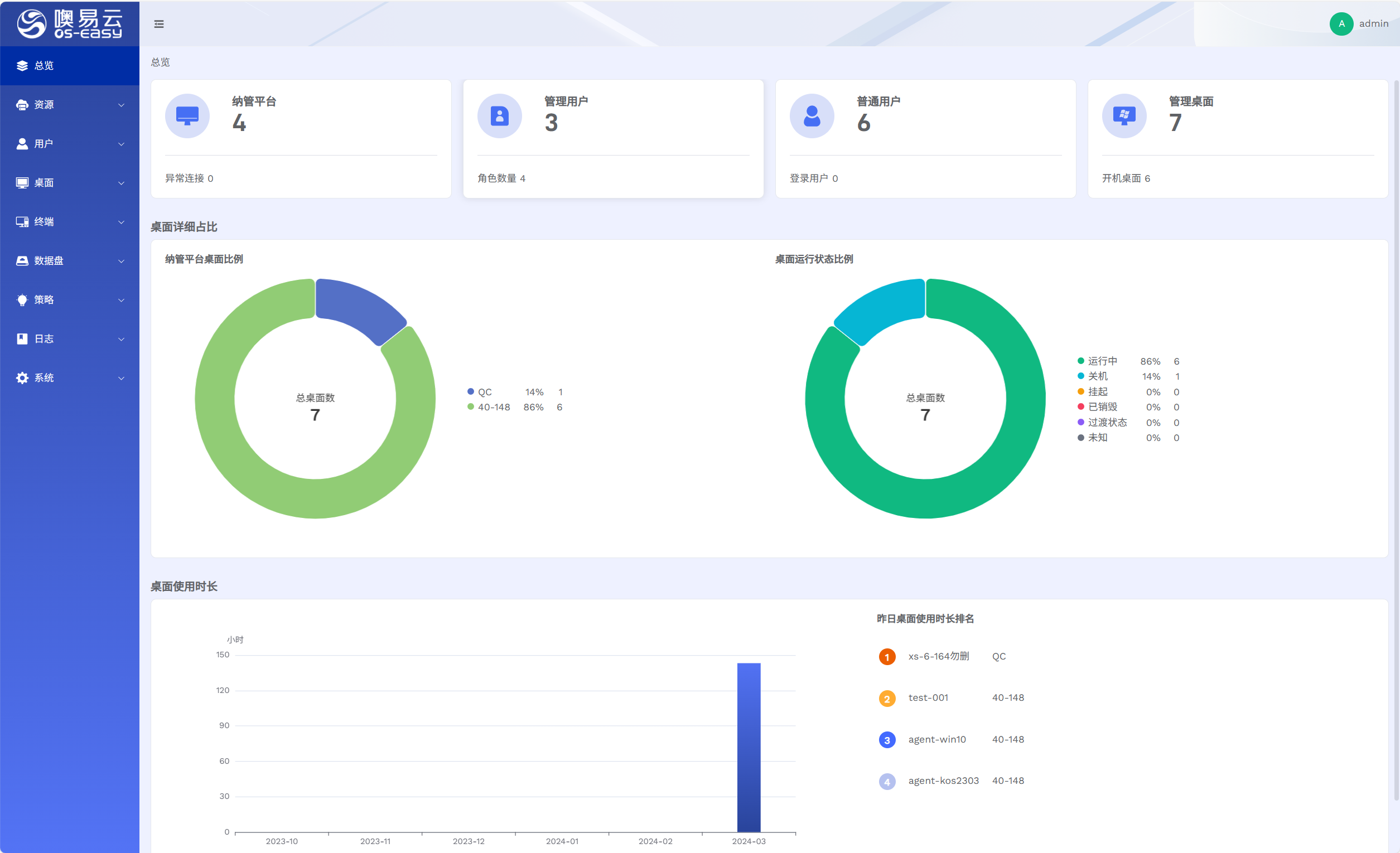 噢易云上桌面云服务平台是一款基于第三方云平台开发的产品,通过自研桌面云技术和OEIDP高性能桌面协议,进行接管第三方云平台资源。以面向大型央国企、金融等行业的私有云或混合云客户,满足个人办公、研发、设计等桌面使用场景,给企业办公用户提供随时随地可用的办公云、设计云、虚拟仿真云以及培训学习云等资源,交付高性能桌面环境,提供流畅的桌面使用体验,提升企业云资源利用率。
