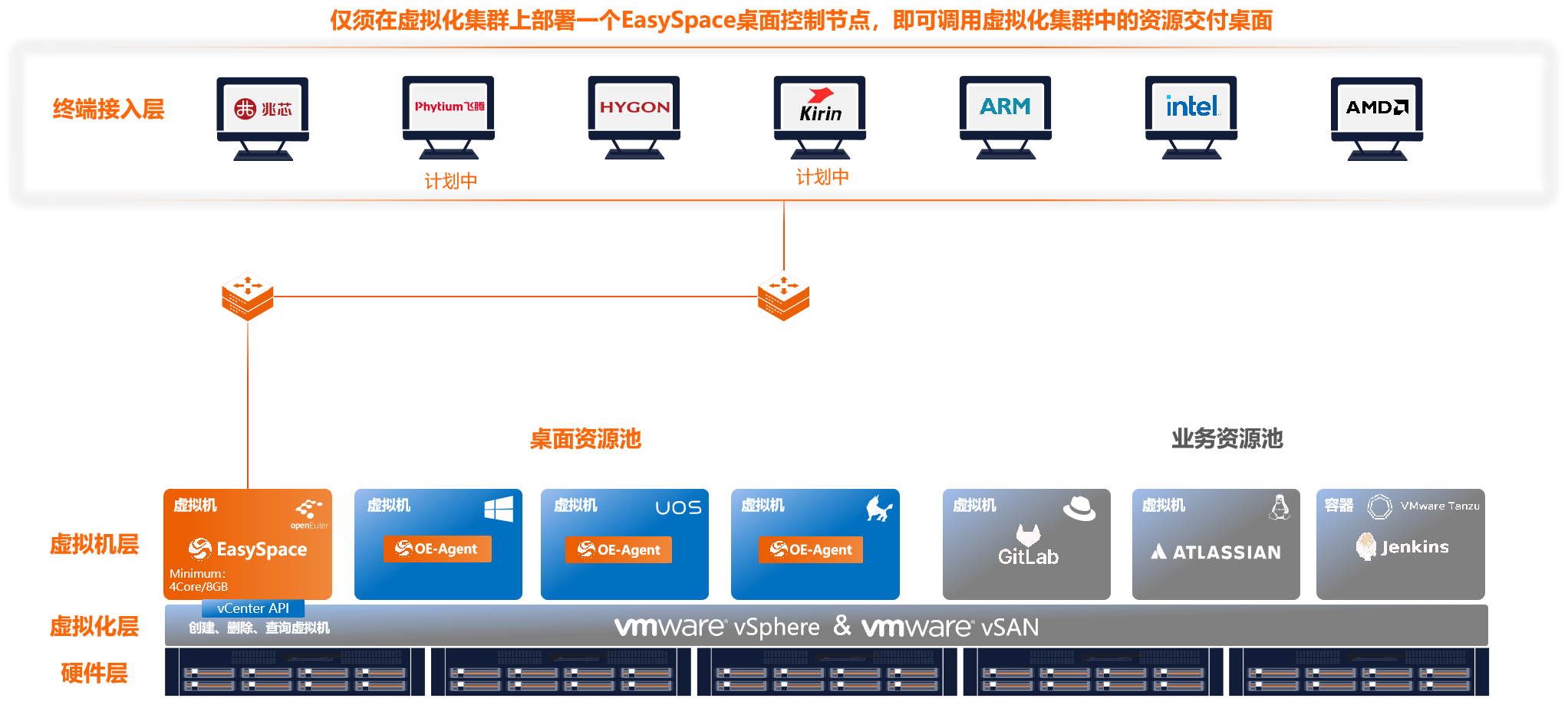 根据项目的不同,云上桌面云平台可在虚拟机或物理机上快速部署,同时支持服务器集群模式,支持平台的横向扩展,确保用户后续扩容无忧。