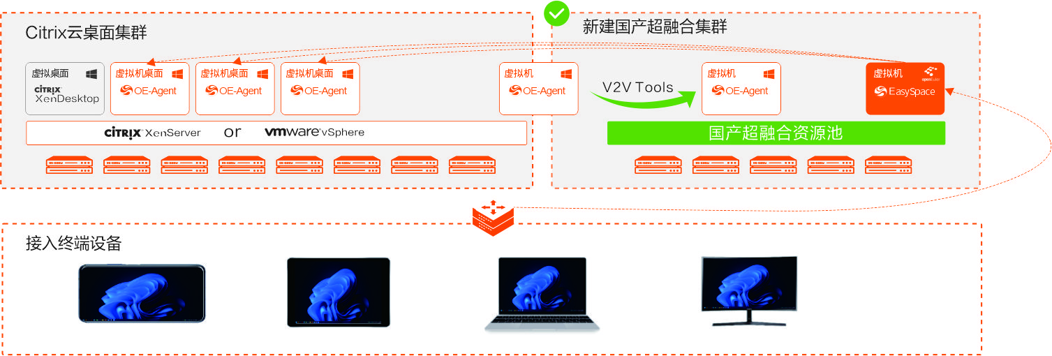 替换思杰Citrix的云桌面平台,支持对接多种类型的底层云平台(XenServer,Vmware)用户无需更换现有底层虚拟化云平台,只需更换协议,即可快速上云。